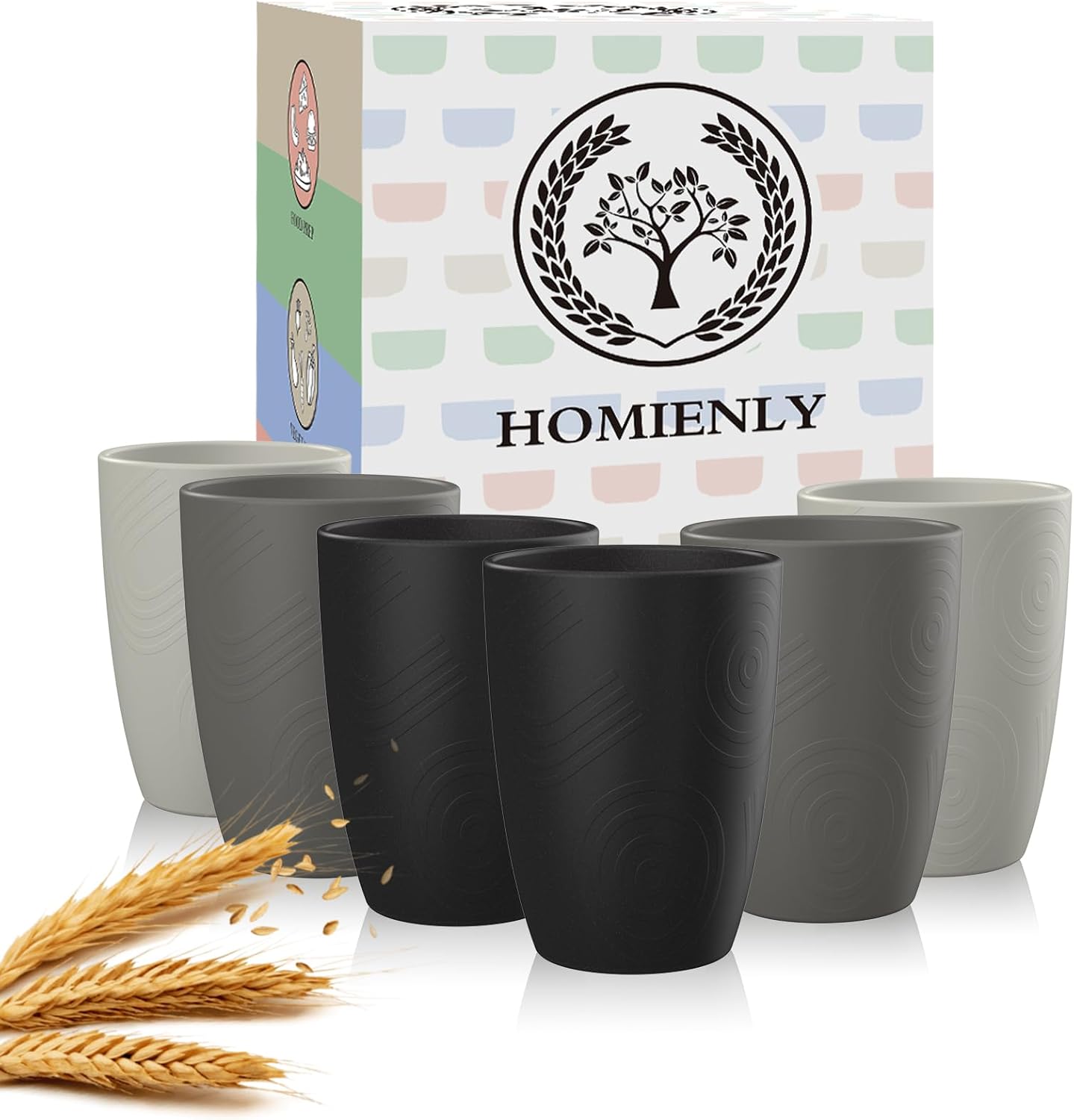 Homienly Wheat Straw Stackable Water Tumblers 6 PCS Cups Alternative to Plastic Drinking Cup (12 OZ Black Grey Stone)