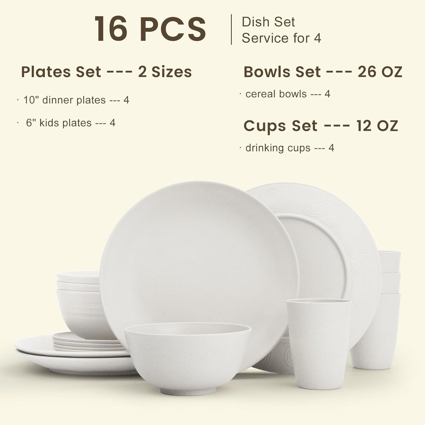 Homienly Wheat Straw Dinnerware Sets - 16 PCS Unbreakable Dinner Plates,Dessert Plates,Cereal Bowls,Drinking Cups,Dishes Sets for 4?Reusable Dishwasher & Microwave Safe for Kitchen - White