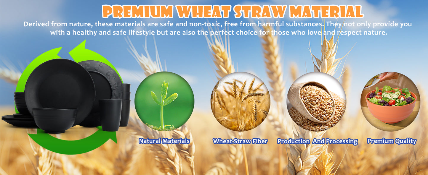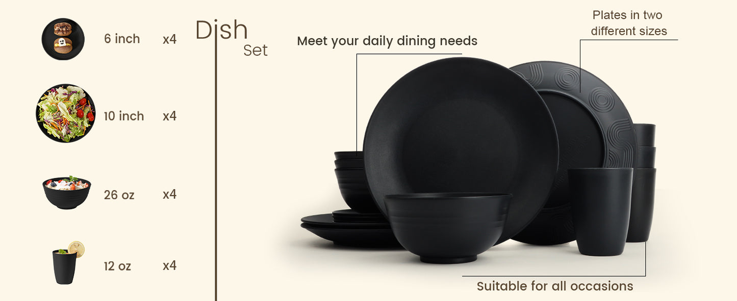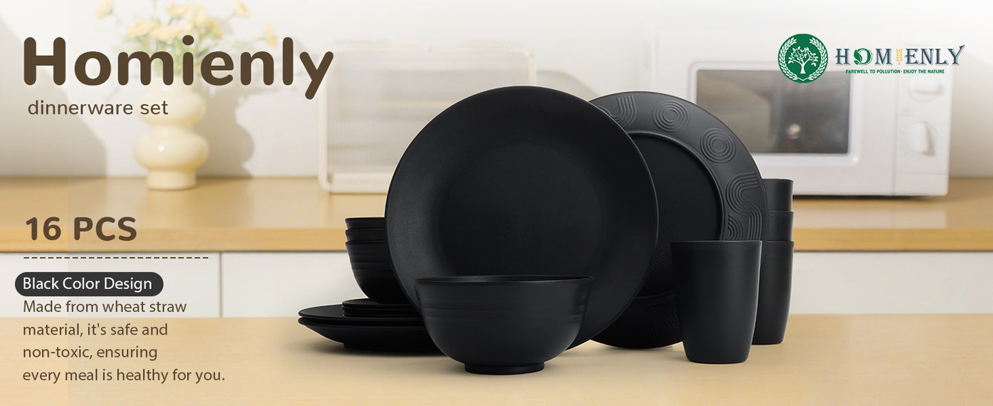 Homienly 16-Piece Wheat Straw Dinnerware Sets, Reusable Unbreakable Plates and Bowls Sets,Cups,Service for 4, Premium Dishwasher and Microwave Safe Dish Sets for Kitchen,Outdoor - Black
