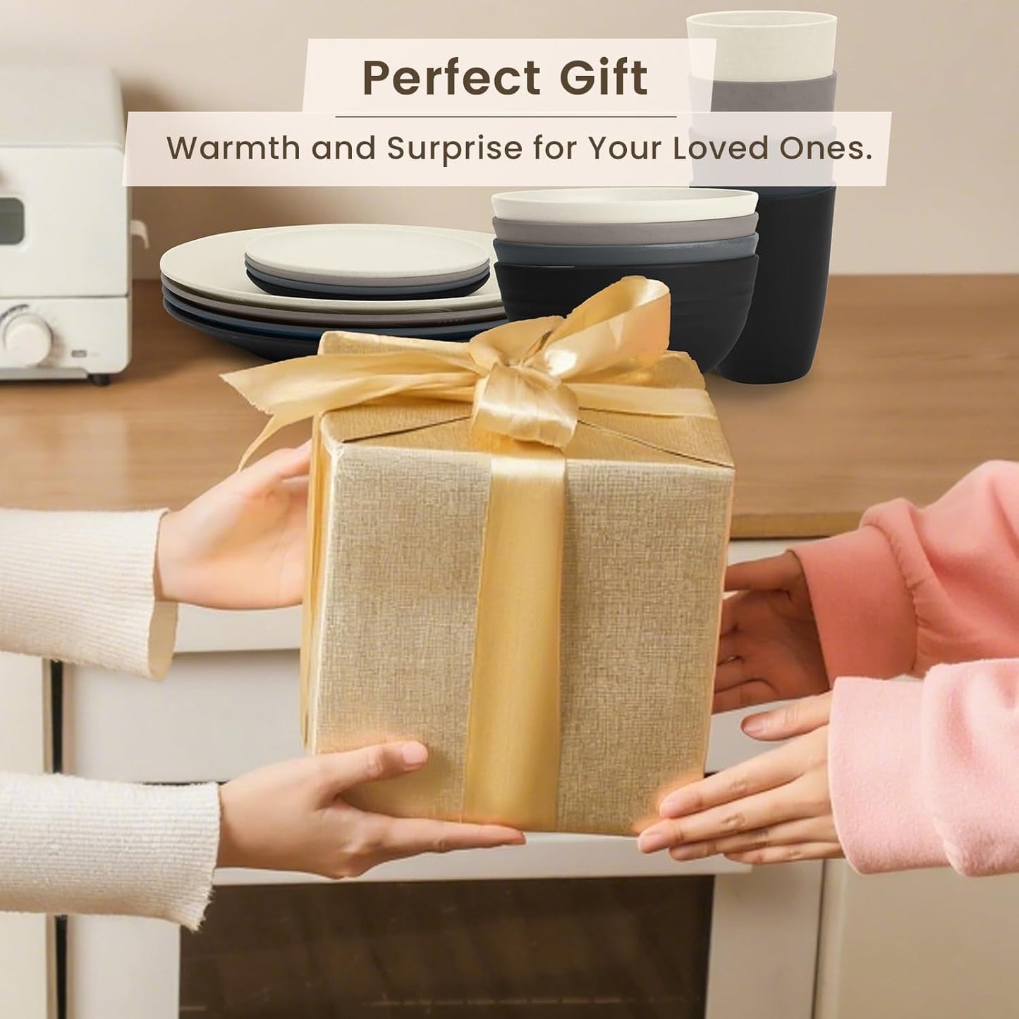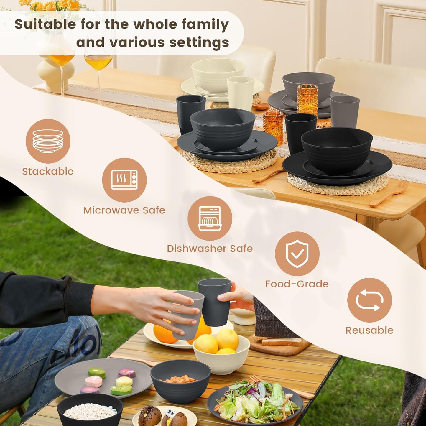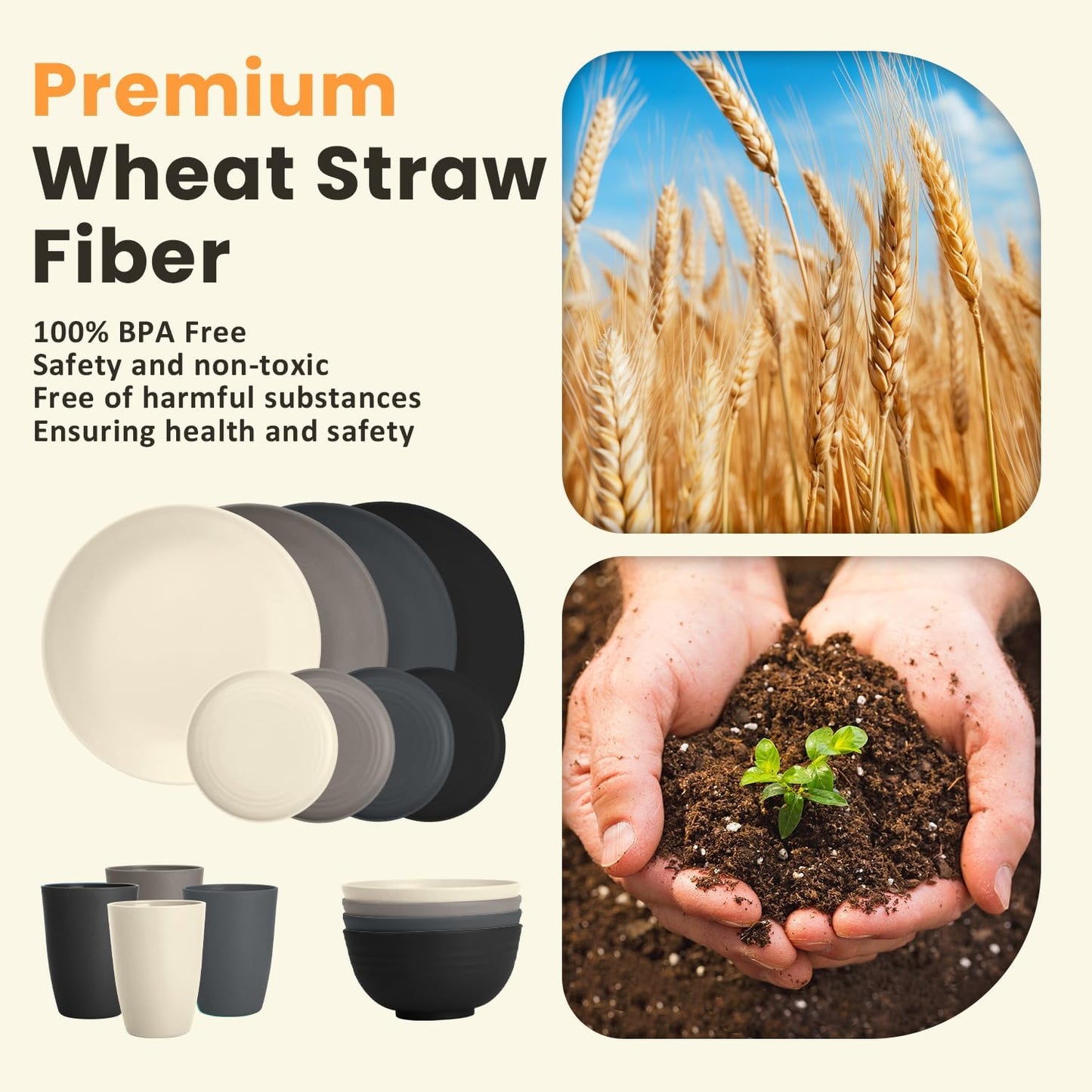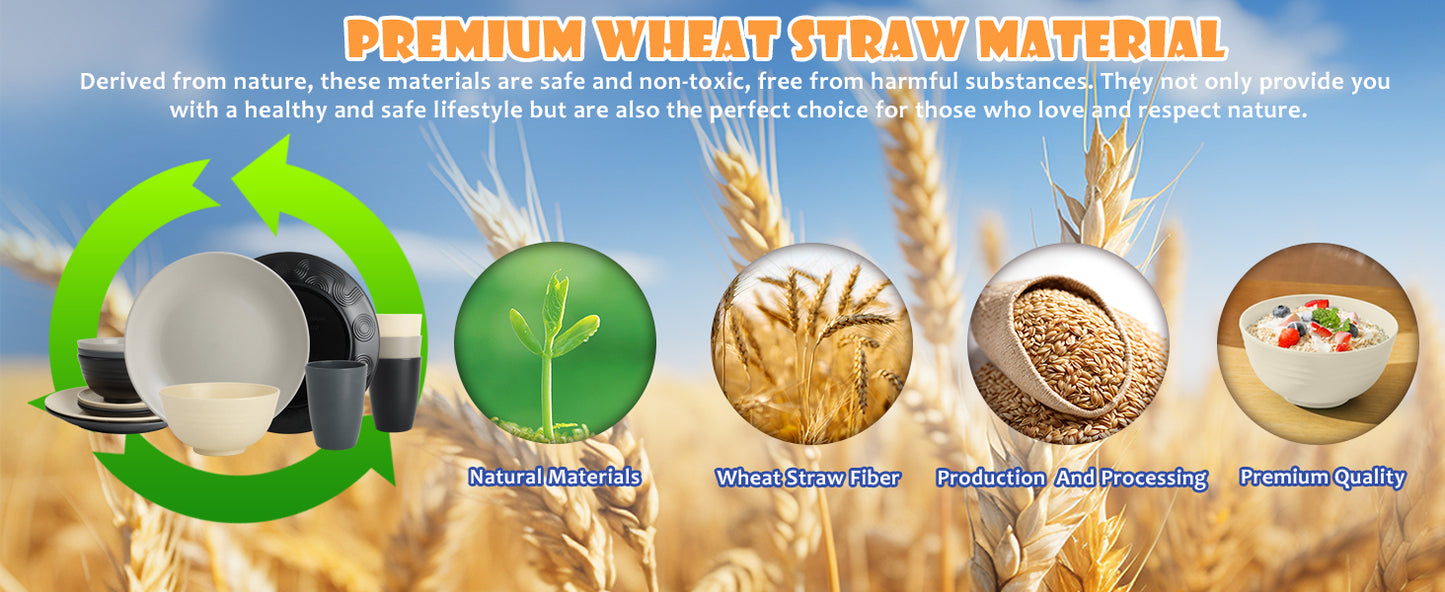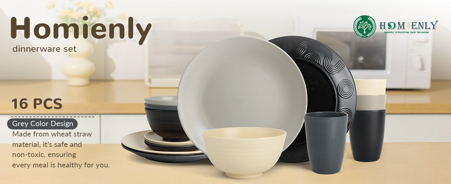 Homienly Wheat Straw Dinnerware Set - Dinner Plates, Cereal Bowls, Drinking Cups Set, Unbreakable 16 PCS Dish Set, Microwave and Dishwasher Safe Dishes for Home, Outdoor - Grey Stone